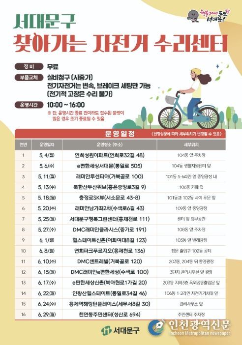 [인천광역신문] 최예준 기자 | 서대문구가 주민들의 자전거 이용 활성화와 안전한 운행을 위해 5∼6월과 9∼11월 ‘찾아가는 자전거 수리센터’를 총 32회 운영한다.