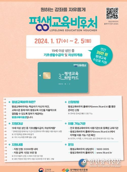 [인천광역신문] 관리자 기자 | 교육부와 국가평생교육진흥원(원장 직무대행 심한식)은 1월 17일부터 2월 5일까지 2024년 평생교육이용권(평생교육바우처) 신청을 접수한다.