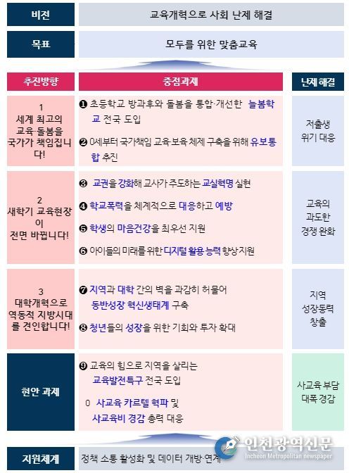 [인천광역신문] 관리자 기자 | 교육부는 1월 24일 2024년 주요정책 추진계획을 발표한다. ‘교육개혁으로 사회 난제 해결’이라는 비전 아래 교육개혁이 지역 곳곳에 성공적으로 뿌리내리는 한 해가 될 수 있도록 올해 중점적으로 추진할 10대 과제를 선정했다. 주요 내용은 다음과 같다.