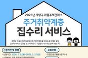 [인천광역신문] 관리자 기자 | 인천광역시 계양구는 작전동에 운영 중인 마을주택관리소에서 주거취약계층을 위한 집수리 서비스를 추진한다고 밝혔다. 올해 추진되는 집수리 서비스는 2025년 5차 신청 81가구에 대한 집수리가 지난해 12월 완료됨에 따른 사항으로, 오는 2월 9일부터 27일까지 관할 동 행정복지센터에 방문해 신청할 수 있다. 신청 서식과 세부 사항은 계양구청 누리집 ‘공지사항’에서 확인 가능하다. 신청 대상은 사용승인(준공) 이후 20년 이상 경과한 노후・불량 단독 및 공동주택 ('공동주택관리법'에 따른 관리주체가 있는 공동주택을 제외)에 거주하는 계양구 주민 중, 65세 이상 고령자, 독거노인, 장애인, 국가유공자 등 집수리 지원이 필요한 주거취약계층이다. 신청 분야는 도배・장판・샤워기・변기・방충망 등의 경보수 집수리이며, 현장 점검 후 집수리 교육을 이수한 자원봉사자들과 함께 작업이 진행될 예정이다. 구 관계자는 “접수된 신청 사항을 바탕으로 집수리 전문 인력이 현장을 방문해 수리가 필요한 부분을 면밀히 점검하고, 신속하게 지원하겠다.”라며 “주거 취약계층의 생활 불편을