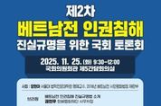 [인천광역신문] 관리자 기자 | 민형배 의원(더불어민주당, 광주 광산을)이 마련한 '제2차 베트남전 인권침해 진실규명을 위한 국회 토론회'가 내일(25일) 오전 9시 30분부터 국회의원회관 제5간담회의실에서 개최된다. 이번 토론회는 베트남전 파병군인 인권침해에 대한 진실규명 문제를 논하는 최초의 공개 토론회이다. 지난 9월 30일 민형배 의원은 '베트남전쟁 시기 대한민국 국군에 의한 민간인 및 파병군인 등에 대한 인권침해 사건 진실규명특별법안'(민형배 의원 등 30명 공동발의, 이하 베트남전 진실규명법)을 발의했다. 이 법안은 한국군에 의한 집단학살 등 인권침해 사건뿐만 아니라 파병군인의 자살·전쟁 후유증 등을 조사 범위에 포함하도록 한다. 법안 발의에 이어 개최되는 이번 토론회에서는 베트남전 파병군인이 겪은 군 내부 폭력·자살·전쟁 후유증 등의 인권침해를 중심으로 논의한다. 양현아 서울대 법학전문대학원 명예교수가 사회를 맡고, 하미학살 피해생존자 응우옌티탄이 영상 발언을 통해 베트남전 진실규명법 제정을 국회와 시민사회에 호소한다. 노용석 교수(국립부경대학교)가 “베트남전 파병과 민주주의, 그리고 파병군인