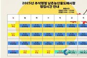 [인천광역신문] 최예준 기자 | 인천광역시 남촌농축산물도매시장관리사무소는 다가오는 추석 명절을 맞아 시민들이 안전하고 편리하게 도매시장을 이용할 수 있도록 종합대책을 마련·추진한다고 밝혔다. 이번 대책은 농·축산물 수급 안정과 함께 안전, 교통, 환경 관리에 중점을 두고 추진한다. 먼저 농·축산물 수급 안정을 위해 사과, 배, 배추, 무, 양파, 마늘, 감자, 밤, 대추 등 9개 주요 농산물 4,936톤과 소·돼지고기 등 축산물 592톤을 공급한다. 이는 지난해보다 15% 이상 늘어난 물량으로, 성수품을 충분히 확보해 시민들이 평시보다 저렴한 가격에 구매할 수 있도록 할 계획이다. 또한 시민들의 장보기 편의를 위해 시장 영업시간을 기존 오후 3시에서 오후 5시까지 2시간 연장한다. 정기 휴무일인 9월 28일과 10월 5일에도 정상 운영해 추석 장보기에 불편이 없도록 할 계획이다. 다만 추석 연휴 기간인 10월 6일부터 8일까지는 휴업하고, 9일부터 영업을 재개한다. 아울러, 불법 유통행위와 거래질서 위반을 막기 위한 지도·단속반을 편성해 운영한다.
