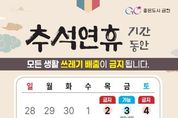 [인천광역신문] 최훈 기자 | 금천구는 추석 연휴 기간 생활쓰레기(일반생활쓰레기, 음식물쓰레기, 재활용품) 수거를 일시 중단한다고 밝혔다. 환경미화원들의 휴식권을 보장하고 안전한 근무 환경을 조성하기 위한 조치라고 구는 설명했다. 수도권매립지관리공사와 청소대행업체도 휴무다. 이에 따라 주민들은 10월 3일과 7일, 9~10일 오후 6시부터 자정까지 대형생활폐기물을 제외한 모든 생활쓰레기를 배출할 수 있다. 연휴 기간 중 생활쓰레기 배출이 금지되는 날은 2일과 4~6일, 8일, 11일이다. 구는 쓰레기배출이 일시 중단됨에 따라 주민 불편을 최소화하기 위한 청소상황실과 청소대행업체 기동반을 편성·운영한다. 쓰레기 관련 민원에 신속히 대응할 방침이다. 또한 연휴가 끝나는 10일부터는 인력과 장비를 총동원해 적체된 쓰레기를 일제 수거할 계획이다. 유성훈 금천구청장은 "평소에 묵묵히 금천의 청결을 책임지고 있는 환경미화원 분들께 감사드린다“라며 ”추석 연휴 기간 쓰레기 배출일을 꼭 확인하시어, 서로 배려하고 즐거운 명절을 보낼 수 있도록 주민 여러분의 많은 이해와 적극적인 참여를 부탁드린다”라고