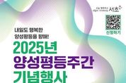 [인천광역신문] 최훈 기자 | 서울 서초구는 양성평등주간(9월 1일~7일)을 맞아 오는 9월 3일 오후 2시, 구청 2층 대강당에서 '2025년 서초구 양성평등주간 기념행사'를 개최한다고 밝혔다. 올해 행사는 ‘내일도 행복한 양성평등을 향해!’를 주제로 열리며, 축하공연과 기념식, 시상식, 명사 특강, 체험 부스 등 다채로운 프로그램이 마련된다. 특히 구민이 직접 참여할 수 있는 기회를 확대해 양성 평등 문화 확산에도 기여할 것으로 기대된다. 사회는 다둥이 아빠로 널리 알려진 보컬그룹 V.O.S의 박지헌 씨가 맡는다. 행사는 백석예술대학교 댄스팀 ‘B.D.O’와 서초 청년예술인 ‘햇바라기’ 팀의 축하 공연으로 시작된다. 이어 기념식에서는 ‘AI 기술로 제작한 서초구 홍보영상’과 ‘2025 세계 여성의 날 공식 포즈 퍼포먼스’를 감상하는 시간을 갖는다. 또한 ‘제11회 서초여성상 시상식’과 ‘양성평등 우리가족 그리기 대회’ 공모전 시상식을 통해 양성평등 실천에 기여한 주민과 가족을 격려하는 시간도 가질 예정이다. 행사의 하이라이트로는 성균관대학교 최재붕 교수의 명사 초청 특강이 진행된다. ‘양성평등한 AI 시대,