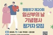 [인천광역신문] 최훈 기자 | 영등포구가 오는 10월 1일 오후 7시, 시립문래청소년센터 달촌공연장에서 ‘제20회 임산부의 날 기념행사’를 연다고 밝혔다. 행사는 임신과 출산의 소중함을 되새기고, 임산부와 가족이 함께 힐링할 수 있는 특별한 자리로 마련했다. 첫 순서는 순천향대학교 부천병원 산부인과 김태희 교수의 특강이다. ‘출산 준비부터 회복까지, 건강 체크리스트’를 주제로 ▲출산 전 준비사항 ▲산모 건강 관리법 ▲출산 직후 회복 요령 ▲가족이 함께할 수 있는 지원 방법 등 실질적이고 유익한 정보를 전한다. 이어 팝페라 듀엣 ‘뚜뚜빠빠’가 무대에 올라 ‘넬라 판타지아’, ‘오 솔레미오’ 등 친숙한 선율을 선사하며 따뜻한 위로와 감동을 선사한다. 행사장에는 다채로운 체험부스도 운영된다. ▲1년 후 아기에게 보내는 편지 ‘느린우체통’ ▲예비 아빠의 임부복 체험 ‘아빠는 임신 중’ ▲임산부 즉석 기념사진 ‘주인공은 나야 나’를 운영해 임산부와 가족이 특별한 추억을 남길 수 있다. 참여한 임산부에게는 비대면 손태교 프로그램으로 ‘토수니 애착인형 바느질 키트’도 제공된다. 참가자는 교육 영상을 참고해 가정