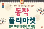 [인천광역신문] 최훈 기자 | 동작구가 오는 11월 1일 오전 10시부터 오후 5시까지 구청 옛 청사 주차장(노량진역 5번 출구)에서 ‘2025 추억과 나눔이 오가는 동작 가을장터’를 연다고 밝혔다. 이번 행사는 주민과 단체가 직접 참여하는 ‘플리마켓’과 김장철 맞이 ‘직거래장터’를 한자리에서 즐길 수 있도록 기획됐다. 먼저 플리마켓은 약 30개 부스에서 의류, 도서, 소품 등 다양한 중고 물품을 판매하며 일상 속 자원순환 문화를 실천하는 장으로 마련된다. 직거래장터에서는 자매결연 도시 등에서 들여온 김장철 필수 품목(배추, 무, 고춧가루 등)과 지역특산물이 시중가보다 최대 33% 저렴하게 판매된다. ▲축산물 타임세일(11시·13시·15시) ▲선착순 증정품 지급 ▲당일 배달서비스(박스 단위, 관내 한정) ▲칼갈이 부스(인당 2개, 개당 100원) 등 다양한 이벤트도 진행된다. 아울러 주민들이 즐길 수 있는 ‘체험 프로그램(한지 무드등·편백 향낭 만들기 등)’과 구청 직원이 참여하는 ‘사랑 나눔 바자회’도 운영된다. 바자회 수익금은 동작복지재단 등에 후원금으로 활용될 예정이다. 이와 함께