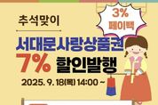 [인천광역신문] 최훈 기자 | 서대문구가 추석 명절을 앞두고 지역사회 내 소비 촉진을 통한 소상공인 매출 증대와 민생경제 활성화를 위해 이달 18일 오후 2시부터 모바일 서대문사랑상품권을 발행한다. 발행 규모는 20억 원으로 구는 높아진 상품권 구매 수요에 부응하기 위해 당초 15억 원에서 5억 원을 증액했다. 앞서 올해 2월과 4월 상품권 발행 때에는 단시간에 매진을 기록한 바 있다. 기존 5%였던 할인율이 이번에는 7%로 높아졌다. 여기에다 사용 금액에 대한 3% 페이백(보상 환급)까지 이뤄지면 최대 10%의 할인을 받는 셈이다. 서대문사랑상품권은 서울페이플러스(서울Pay+) 앱을 통해 온라인으로 1인당 월 50만 원까지 액면가 대비 7% 할인된 가격(500,000원 상품권 구입 시 465,000원 지불)으로 누구나 구입할 수 있다. 참고로 보유 한도는 최대 150만 원이다. 이 상품권은 서대문구 내 서대문사랑상품권 가맹점(서울페이플러스 앱에서 검색)에서 사용 가능하다. 단, 유흥 및 사치 업종, 대규모 점포, 대기업·중견기업 프랜차이즈 직영점, 연매출액 30억 원 초과 입시학원 등은 제외. &