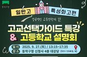 [인천광역신문] 최훈 기자 | 동작구가 오는 27일 오후 1시 15분부터 구청 신청사 4층 대강당과 소회의실에서 ‘고교 선택 가이드 특강 및 고등학교 설명회’를 개최한다고 밝혔다. 이번 행사는 중학생과 학부모가 고등학교 진학을 준비하며 겪는 고민을 덜고, 학교별 특성과 맞춤형 정보를 제공하기 위해 마련됐다. 먼저 메인 프로그램인 ‘고교 선택 가이드 특강’은 오후 2시부터 대강당에서 펼쳐진다. EBS 입시 전문 강사인 정제원 숭의여고 교사가 강연자로 나서 대입전형 변화에 따른 일반고와 특성화고 진학 전략을 상세히 안내한다. 아울러 ‘고교 설명회’에는 관내 7개교와 관악구 2개교가 참여하며, 학교별 담당 교사가 직접 특화 프로그램과 진학 사례 등을 소개하고 학부모와 학생들의 궁금증을 해소한다. ▲1회차(13:15~13:50) ‘서울공고, 당곡고’ ▲2회차(15:40~16:15) ‘경문고, 숭의여고’ ▲3회차(16:20~16:55) ‘영등포고, 수도여고’ ▲4회차(17:00~17:35) ‘성남고, 서울문영여고’ 순으로 열린다. 특히, 오후 3시 10분에는 내년 3월 개교를 앞둔
