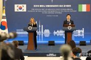 [인천광역신문] 박진 기자 | 이재명 대통령은 19일 조르자 멜로니 이탈리아 총리와의 정상회담 뒤 "저와 멜로니 총리는 전략적 동반자 명칭에 부합하는 미래지향적 수준으로 양국 관계를 더욱 발전시켜 나가기로 합의했다"고 밝혔다. 이 대통령은 이날 청와대에서 멜로니 총리와의 정상회담 후 '공동 언론 발표'에서 이같이 말했다. 이 대통령은 "교역 분야 협력은 양국 경제규모와 브랜드 파워에 걸맞은 수준으로 더욱 확대하기로 했다"며 "이를 위해 양국 기업이 참여하는 한-이탈리아 비즈니스 포럼을 새 기회 창출의 장이자 기업 애로 상담 창구로 활성화하는 데 뜻을 모았다"고 밝혔다. 이어 "특히 중소기업 생태계가 잘 발달한 이탈리아의 강점을 바탕으로 중기 육성과 지원에 관한 협력도 함께 추진해 나갈 것"이라고 말했다. 이 대통령은 또 "국가 미래가 달린 과학분야 협력이 더욱 확대될 것"이라며 "기초응용분야 공동연구지원을 통해 역량 있는 연구자를 지속 발굴하고 인공지능, 우주항공 같은 첨단산업으로 협력의 지평을 더욱 넓혀가겠다"고 밝혔다. 이어 "방산 분야에서도 서로 강점에 기초해 상호 보완적 협력을
