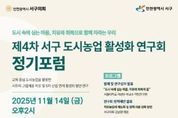 [인천광역신문] 최예준 기자 | 인천 서구의회 《서구 도시농업 활성화 연구회》는 14일 오후 2시, 서구청 대회의장에서 제4차 정기포럼을 개최한다. 이번 정기포럼 주제는‘도시 속에 심는 마음, 치유와 회복으로 함께 자라는 우리’로 발제는 서울대학교 이성우 책임연구원이 맡는다. 그동안 연구단체는 치유와 힐링의 도시농업 연구에 따른 자연친화, 환경회복 도시환경 조성을 주제로 연구 활동을 지속해 왔다. 전국 우수사례 현장 견학 13회와 정책 연구용역 2건을 진행했고, 포럼과 세미나를 3차례 개최했다. 이번 보고회는 그간의 왕성한 활동을 통해 얻어진 연구 성과의 최종 발표로 도시농업에 관심이 많은 구민들의 기대를 모으고 있다. 특히 이번 행사는 부대 프로그램도 함께 열려 더욱 풍성하다. ‘도시농업으로 만드는 치유와 회복의 여정’ 연구활동 성과와 참여 기관의 치유농업 성공 사례 성과물도 함께 전시한다. 이번 정기포럼에 대해 김남원 대표 의원은 “3년 동안의 단일 주제로 연구 활동을 해왔다”, “2023년 처음 활동 당시 의원님 그대로 열과 성의를 다해 동참해 주신 결과의