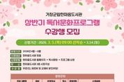 [인천광역신문] 관리자 기자 | 거창군 한마음도서관은 오는 3월 5일부터 군민들의 지적 욕구를 충족시키고 문화적 소양을 높이기 위한 ‘상반기 독서문화 프로그램’ 수강생을 모집한다. 이번 프로그램은 4월 1일부터 6월 30일까지 운영되며, 초등학생부터 성인까지 전 세대가 참여할 수 있도록 다채로운 강좌로 구성됐다. 수강 신청은 한마음도서관 누리집에서 가능하며 수강료는 무료이나 재료비는 본인 부담이다. 먼저 초등학생 대상으로는 그림책을 읽고 다양한 미술 기법으로 감상을 표현하는 ‘그림책 아트팡팡’과 영어 그림책을 함께 읽으며 독후 활동을 진행하는 ‘잉글리쉬 Book플레이’ 등 2개 강좌를 운영해 어린이들의 흥미로운 독서 경험과 올바른 독서 습관 형성을 돕는다. 성인을 위한 프로그램으로는 취미와 인문학적 소양을 함께 기를 수 있는 5개 강좌가 마련됐다. 감성을 깨우는 ‘한마음시낭송’을 비롯해 ‘주역’, ‘수수공방’, ‘보타니컬아트’ 그리고 명화를 통해 인간의 심리를 이해하는 ‘명화 속 심리학’ 등 다양한 강좌가 운영되어 일상에 예술적 깊이와 배움의 즐거움을 더할 예정이다. 한편, 프로그램 문의는 한마음도