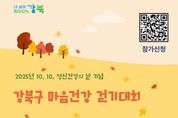 [인천광역신문] 최훈 기자 | 서울 강북구는 오는 28일 오후 2시부터 4시까지 정신건강의 날 기념 마음건강 걷기대회를 개최한다. 이번 행사는 ‘10월 10일 정신건강의 날’을 기념하여 주민들이 걷기 활동을 통해 일상 속 마음건강을 돌보고, 정신건강의 중요성에 대한 사회적 인식을 높이기 위해 마련됐다. 걷기 코스는 강북구보건소 맞은편 버스정류장에서 출발해 벌리교까지 이어지는 우이천변 1.5km 구간으로, 가을 정취를 느끼며 여유롭게 걷기 활동을 즐길 수 있다. 체험을 통해 정신건강의 중요성을 느낄 수 있도록 풍성한 프로그램도 준비됐다. 주요 프로그램으로는 △마음건강 스탬프 챌린지 △정신건강복지센터 회원들의 작품 전시 △마음건강 포토부스 및 홍보부스 등이 있으며, 행사 참여자와 완주자에게는 소정의 기념품이 제공될 예정이다. 마음건강에 관심 있는 지역주민이면 누구나 걷기대회에 참여할 수 있으며, 모집 인원은 선착순 300명이다. 참가 신청은 24일 오후 6시까지 강북구청 홈페이지 또는 강북구정신건강복지센터를 통해 가능하다. 이순희 강북구청장은 “마음을 돌보는 작은 걸음이 개인의 행복뿐 아니
