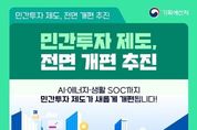 [인천광역신문] 관리자 기자 | AI·에너지·생활 SOC까지 민간투자 제도가 새롭게 개편됩니다! 1. 민간투자 제도란? 사회 기반 시설에 대한 민간의 투자를 촉진하여 창의적·효율적으로 사회기반시설을 확충·운영하는 제도 제도 도입 이후 30년 동안 총 872개 사업, 약 154조 원 규모의 민자사업 추진 → AI 등 신산업 분야, 노후시설 성능 개선 등 급증하는 투자 수요에 대응하기 위해서는 재정과 민간투자의 병행이 필수! 2. 이렇게 달라집니다. - 신사업·신유형 확대 - 국민 참여 확대 및 국민 생활 편익 증진 - 지방의 민자 활성화 및 민자사업의 안전 강화 - 절차 단축 등 사업 추진 여건 개선 4대 분야 20개 과제 마련으로 '민간투자의 패러다임 전환' 3. ① 신사업·신유형 확대 AI 데이터센터, 전력망, 철도 복합 시설 등 신산업·신유형 분야에 민간투자 활용 전통적 SOC(도로·철도 등)에서 벗어나 신산업 분야에도 민자 방식을 도입하고, 단순 운영형 민자 신설, 대상지 공모 방식 개선 등으로 신유형 사업 방식을 활성화합니다. ② 국민 참여 확대 및 편익 증진 일반