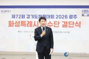 [인천광역신문] 관리자 기자 | 화성특례시의회는 26일 화성종합경기타운 3층 라운지홀에서 열린 제72회 경기도체육대회 화성시 선수단 결단식에 참석해 선수단을 격려하고 4연패 달성을 위한 결의를 다졌다. 이날 행사에는 배정수 의장을 비롯해 김종복 문화복지위원장, 송선영·이용운 의원, 화성시체육회 임원과 종목단체 관계자, 선수단 등 약 150여 명이 참석했다. 이날 결단식은 경기도체육대회 출전을 앞둔 선수단의 사기를 높이고 각오를 다지는 자리로 마련됐다. 화성특례시 선수단은 오는 4월 16일부터 18일까지 광주시 일원에서 열리는 제72회 경기도체육대회에 출전한다. 육상, 수영, 축구 등 27개 종목에 참가해 종합우승 4연패에 도전한다. 배정수 의장은 “묵묵히 쌓아온 훈련의 시간과 노력을 믿고 끝까지 당당하게 경기에 임해주시기 바란다”며 “선수 여러분의 땀과 투혼이 화성특례시의 자부심”이라고 말했다. 이어 “화성특례시의회도 선수들이 오직 경기에 집중할 수 있도록 체육 환경 조성과 지원에 최선을 다하겠다”며 “4연패 달성을 진심으로 기원한다”고 덧붙였다. 화성특례시의회는 선수들이