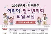 [인천광역신문] 최예준 기자 | 마포구는 4월 6일부터 24일까지 ‘제4기 어린이·청소년의회’ 위원을 모집한다. 어린이·청소년의회는 어린이와 청소년이 지역사회 구성원으로서 지역 현안을 논의하고 정책을 제안하는 참여기구다. 의원으로 선발되면 위촉장과 의원 배지를 수여하고 상임위원회 회의와 본회의 등 모의 의정활동에 참여하며 지방의회의 역할과 기능을 체험한다. 이 과정에서 정책과 사업, 입법 제안 등 다양한 의정 과정을 경험하고, 발굴한 정책을 실제 구정에 반영할 기회도 주어진다. 또한 의회 견학과 리더십·자질 함양을 위한 소양교육 등을 통해 민주시민으로서의 역량을 기를 수 있다. 모집 대상은 마포구에 거주하거나 지역 내 학교에 재학 중인 18세 미만 아동으로, 어린이의회(13세 미만)와 청소년의회(13세 이상 18세 미만)로 나눠 각각 50명씩 총 100명 이내를 선발할 예정이다. 모집은 학교 추천과 기관 추천, 개인 신청으로 진행되며, 마포구청 누리집 공지사항에 게재된 신청서를 작성해 담당자 전자우편 또는 마포구청 가족정책과에 제출하면 된다. 선발된 위원은 오는