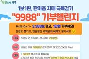 [인천광역신문] 관리자 기자 | 광주광역시 서구가 오는 20일부터 11월 6일까지 18일간, 치매 인식 개선과 기부문화 확산을 위한 ‘1보1원, 한마음 치매극복걷기 9988 기부챌린지’를 진행한다. 이번 챌린지는 치매상담콜센터 홍보와 함께 주민 참여를 통해 치매 극복에 대한 지역사회의 관심을 높이기 위해 기획됐다. 치매상담콜센터는 연중무휴로 전문상담사가 맞춤형 상담을 제공하는 서비스로 ‘18세 기억을 99세까지, 99세까지 팔팔(88)하게’라는 의미를 담고 있다. 참가자는 ‘워크온(Walk On)’ 앱을 활용해 하루 평균 9988보를 달성할 경우 ‘1만원 기부권’을 받을 수 있으며 챌린지 종료 후 만족도 조사와 기부 동의 절차를 완료하면 기부권이 서구 관내 취약계층 치매환자 가구에 전달된다. 서구는 총 300명의 챌린지 달성자를 목표로 하며 누적 기부금 300만 원은 치매환자 30가구에 각 10만 원씩 전달할 예정이다. ‘9988 챌린지’ 참여가 어려운 주민은 하루 동안 1만보를 걷고 1만 원을 기부하는 ‘1보1원 순수기부’에 참여할 수 있다. 김이강 서구청장은 “치매는 개