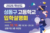 [인천광역신문] 최훈 기자 | 서울 성동구는 오는 10월 16일 오후 6시 30분부터 성동구청 3층 대강당에서 고등학교 진학을 앞둔 학생과 학부모를 대상으로 ‘2026학년도 고등학교 입학설명회’를 개최한다고 밝혔다. 이번 입학설명회는 예비 고등학생과 학부모를 대상으로 고교학점제에 대한 이해를 높이고, 지역 내 일반계 고등학교별 입학 정보를 제공하기 위해 성동구와 성동광진교육지원청(교육장 이긍연)이 공동으로 마련한 자리이다. 설명회는 ▲ 1부 고교 진학 대비 특강(강사: 성북강북교육지원청 송치경 장학사) ▲ 2부 성동구 학교별 입학설명회 및 1:1 상담(경일고, 금호고, 도선고, 무학여고, 성수고, 한대부고)으로 진행된다. 1부 특강은 송치경 장학사가 ‘고교 학점제와 대학 입시의 이해·전략’이라는 주제로 강연을, 2부 학교별 설명회는 각 학교의 입학 담당교사가 학교별 특성, 교육 운영 과정, 진로 진학 전략 등을 안내할 예정이다. 특히 학교별 1:1 상담은 설명회 당일 오후 6시부터 참석자 대상 선착순 현장 접수하며, 학교별 입학 담당교사가 맞춤형 개별 상담으로 진행할 예정이다. 설명회는 9월 26일