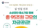 [인천광역신문] 관리자 기자 | 자재 대금결제, 직원 급여와 상여금 등… 설 명절 전후 소상공인·중소기업 등에 총 95조 원 규모의 자금공급! (2.14.~2.18.) - 중소·중견기업 ■ 특별대출, 보증 · 지원기간: ~3.5. · 신청방법: 산업은행, 기업은행, 신용보증기금 지점 상담 - 중소기업·소상공인 ■ 거래 기여도, 신용등급에 따라 은행권 금리우대 대출 · 지원기간: ~3.13. *4대 시중은행 기준(타 은행은 보도자료 참고) · 신청방법: 은행 영업점 방문→설 명절 특별자금지원 상담 - 전통시장 상인 ■ 명절 자금 지원 · 내용 : 연 4.5% 이내 금리 / 최대 1000만 원 대출 · 지원기간: ~2.13. · 신청방법: 우수시장(기초지자체 추천) 소속 상인이 상인회에 신청 [뉴스출처 : 금융위원회]