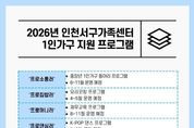 [인천광역신문] 관리자 기자 | 인천서구가족센터(센터장 심정흠)가 급증하는 1인가구의 사회적 고립을 예방하고 삶의 질을 높이기 위해 ‘2026년 1인가구 행복동행사업’의 본격적인 시작을 알리고 참여자 모집에 나섰다. 인천 서구는 최근 청라, 검단 신도시를 중심으로 1인 가구 비중이 급격히 증가하고 있는 지역이다. 이에 인천서구가족센터는 1인 가구의 라이프스타일을 반영해 경제, 건강, 심리 정서 등 실질적인 고민을 해결할 수 있는 다각적인 맞춤형 지원 체계를 구축했다. 올해 운영되는 프로그램은 참여자의 다양한 욕구와 생활 특성을 반영해 총 다섯 가지 테마로 구성되며, 재미와 전문성을 동시에 갖춘 맞춤형 프로그램으로 운영될 예정이다. 먼저, ▲프로소통러는 중장년 1인 가구 간 유대감 형성과 사회적 관계망 확장을 위해 동아리 활동을 지원하는 프로그램으로 참여자들이 서로 소통하고 교류할 수 있는 기반을 마련한다. ▲프로집밥러는 건강한 식생활 형성을 목표로 요리코칭과 식재료 활용 교육을 제공해 일상 속 균형 잡힌 식습관을 돕는다. ▲프로머니러는 경제적 자립과 안정적인 노후 설계를 지원하기 위한 자산 관리 교육을 통해 참여자의 재무
