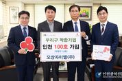 [인천광역신문] 최예준 기자 | 부평구는 주식회사 오상자이엘이 인천 100호이자 부평구 15호 ‘우리구 착한기업’에 가입했다고 16일 밝혔다. 앞서 차준택 구청장과 오상자이엘 김선기 대표이사를 비롯한 임직원, 박용훈 인천사회복지공동모금회 사무처장 등이 참석한 가운데 가입식이 지난 14일 구청에서 열렸다. 이번 가입식은 부평구에서 ‘우리구 착한기업’ 100호가 탄생한 데 대한 상징적 의미와 더불어, 민관이 상생 협력을 통해 사회안전망을 촘촘하게 구축하는 데 의지를 다지는 자리가 됐다. 오상자이엘(주)(대표이사 김선기)은 지난 1993년에 설립된 코스닥 상장 IT 전문 기업으로, 부평구 부평6동에 본사를 두고 있다. 현재 약 190명의 임직원이 근무하며 지역 일자리 창출과 이웃사랑 나눔활동을 바탕으로 지역사회와 함께 성장하고 있다. 오상자이엘(주)은 지난 2020년부터 현재까지 부평6동 행정복지센터에 매월 50만원을 정기 기탁하고 있다. 또, 저소득 취약계층을 위해 2023년에는 부평6동에 300만원을, 올해에는 구에 2천만원을 지원하는 등 꾸준한 지역 나눔을 실천하고 있다. 김선기 오상자