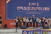 [인천광역신문] 관리자 기자 | 경상북도는 22일 영주시 풍기인삼문화팝업공원에서 민족통일협의회 경상북도 주관으로 ‘2025 민족통일 경상북도대회’를 개최했다. 행사에는 김진현 경북도 안전행정실장, 배진석 도의회 부의장, 유정근 영주시장권한대행, 도재영 민족통일 중앙협의회 의장, 박종호 민족통일경상북도협의회장, 김추길 민족통일 전남회장을 비롯한 시군지회 회원 700여 명과 풍기인삼축제현장을 찾은 많은 관광객과 어울려 뜻깊은 행사를 했다. 행사는 식전 공연을 시작으로, 한반도 평화를 위한 결의문을 회원들과 함께 낭독하고, 이어서 지역사회 및 통일 안보에 이바지한 우수 유공자들에게 도지사 표창을 비롯한 다양한 상패가 수여되며 행사 분위기를 한층 고조시켰다. 특히, 행사 마지막에는 참가자 전원이 함께 ‘우리의 소원은 통일’을 합창하며, 평화통일의 필요성과 중요성을 다시 한번 되새기는 뜻깊은 시간으로 마무리됐다. 박종호 민족통일 경상북도협의회장은 대회사를 통해 “확고한 국가관과 투철한 사명감을 바탕으로 민족의 염원인 조국의 평화통일을 실현할 수 있도록 도민들의 적극적인 참여와 성원”을 당부했다.