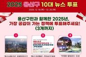 [인천광역신문] 박진 기자 | 서울 용산구가 구민이 직접 올해 가장 의미 있었던 정책을 선정하는 ‘2025 용산구 10대 뉴스’ 온라인 투표를 진행한다. 주민 투표를 통해 정책 성과를 돌아보고, 구정에 대한 관심과 공감을 높이겠다는 취지다. 이번 투표에는 총 25개 주요 정책 사업이 후보로 올랐다. 참여 주민은 이 가운데 3개 사업을 선택하면 되며, 득표수를 합산해 상위 10개 사업을 ‘2025 용산구 10대 뉴스’로 최종 선정한다. 투표 결과는 12월 29일 용산구 누리집을 통해 발표될 예정이다. 후보 정책에는 용산의 중·장기 미래 경쟁력을 좌우할 대형 사업부터 주민 일상과 밀접한 생활 정책까지 폭넓게 포함됐다. 용산국제업무지구 도시개발사업인 ‘용산서울코어’와 전자상가 일대를 AI·ICT 콘텐츠 중심의 신산업 거점으로 육성하는 ‘용산 코어밸리’가 대표적이다. 이태원전망대에서 녹사평광장, 구청사 힐링정원으로 이어지는 ‘이태원 힐링로드’ 조성 사업 역시 도심 속 휴식 공간을 조성하는 주요 정책으로 포함됐다. 경제·교육 분야에서는 △취업박람회 기술인력 양성 등 청년·중장년 취·창업 지원 확대 △골목상권 공동체 및