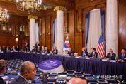[인천광역신문] 관리자 기자 | 이재명 대통령은 25일(현지시간) 미국 워싱턴 D.C. 소재 호텔에서 개최된 '한미 비즈니스 라운드테이블-제조업 르네상스 파트너십'에 참석했다고 대통령실은 밝혔다. 이 대통령의 첫 미국 방문에 맞춰 개최된 이번 행사에는 한국경제인협회의 류진 회장을 비롯, 삼성전자 이재용 회장, SK 최태원 회장, 현대차 정의선 회장, LG 구광모 회장 등 주요 그룹 총수와 한화 김동관 부회장, HD 현대 정기선 부회장, 두산에너빌리티 박지원 회장, 셀트리온 서정진 회장 등 다양한 분야에서 미국과 협력 관계가 큰 16인의 국내기업인들이 참석했다. 미측에서는 엔비디아(NVIDIA) 젠슨 황 CEO, 칼라일(Carlyle) 그룹 데이비드 루벤스타인 공동회장을 포함해 보잉, 다나허, 어플라이드 머티리얼스 등 미국의 대표 기업인 21명이 참석했다. 이 대통령은 기조연설을 통해 "양국 기업인들이 한미 협력의 중추"라고 격려하며, "과거 미국이 한국의 초고속 성장에 기여했듯, 제조업 최고의 기술력을 보유한 대한민국이 미국 제조업 르네상스를 달성할 최적의 파트너임"을 강조했다. 또 "양국이
