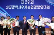 [인천광역신문] 관리자 기자 | 이장우 대전시장이 19일 대전시 농업기술센터에서 열린 제29회 한국후계농업경영인 대전시대회 개회식에서 대전 농업 발전에 기여한 공로로 한국후계농업경영인 대전시연합회로부터 감사패를 받았다. 이번 행사는 ㈔한국후계농업경영인 대전시연합회 주최로 열렸으며, 대전지역 농업인과 농협 관계자, 도시민 등 300여 명이 참석해 농업의 미래를 함께 논의하는 자리가 됐다. 이장우 대전시장은 수상 소감에서 “농업은 국가의 근간 산업으로 식량 안보와 생태계 보전에 중요한 역할을 하고 있다”라며 “과학수도 대전에 걸맞은 첨단기술을 활용해 스마트농업 기반을 조성하고 미래 농업의 성장 동력을 확보하는 데 최선을 다하겠다”라고 말했다. [뉴스출처 : 대전시]