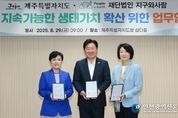 [인천광역신문] 관리자 기자 | 제주특별자치도가 생태문명을 지향하며 생태가치 확산에 앞장서는 재단법인 ‘지구와사람’과 손잡고, 글로벌 생태 협력 중심지로 도약해 나갈 방침이다. 제주도는 29일 도청 삼다홀에서 (재)지구와사람과 ‘제주의 지속가능한 생태가치 확산을 위한 업무협약’을 체결하고, 내년부터 국제생태포럼을 정례 개최하기로 했다. 협약식에는 오영훈 제주도지사와 (재)지구와사람 송기원 이사장, 강금실 공동대표 등이 참석했다. 이번 협약은 ▲세계적 인지도를 갖춘 국제생태포럼 공동 개최 ▲자연과 생태를 주제로 한 국제교류를 위한 협력 ▲자연과 생태 관련 자문 및 연구 협력 등에 대해 적극 협력하는 내용을 담고 있다. 협약을 통해 제주도는 내년부터 세계 각국의 학자와 생태 전문가, 시민사회 인사들이 참여하는 글로벌 생태 협력 플랫폼을 제주에서 운영할 계획이다. 제주도는 이를 통해 ‘글로벌 생태수도’라는 국제적 브랜드를 구축하고, 청정 자연과 생태계 보존 분야에서 선도적 지방정부 모델을 제시한다는 구상이다. 특히 ‘생태법인’ 제도 정착을 위한 협력도 주목된다. 제주의 대표적