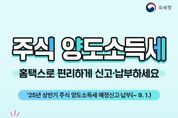 [인천광역신문] 관리자 기자 | ■ 주식 양도소득세 예정신고·납부 안내 · 신고기간: 2025.09.01.(월) 마감. · 신고대상 : 2025년 상반기(1월~6월)에 국내주식을 양도한 개인이 과세대상에 해당하는 경우. ① 상장주식을 양도한 대주주. ② 상장주식을 장외거래한 소액주주. ③ 비상장주식을 양도한 주주. (중소·중견기업 주식을 K-OTC시장에서 거래한 소액주주는 제외) 이번 신고부터는 상장주식을 장외거래한 소액주주와 비상장법인 주주에게도 신고안내를 처음으로 실시합니다! ■ 홈택스 미리채움 서비스 · 미리채움 서비스 양도내역 6가지 항목을 자동으로 채워주는 서비스(양도일자, 양도가액, 양도주식수 등) * 홈택스 미리채움 서비스의 대상자를 장외거래자까지 확대하여 보다 편리하게 전자신고 가능. + 주식 거래내역 조회, 세율선택 도우미, 주식양도 신고도우미 등 다양한 신고도움 서비스를 이용해 보세요! 국세청은 불성실 신고 혐의자에 대해서는 엄정하게 과세하는 한편, 합리적 세정으로 국민의 신뢰를 받는 국세청이 되도록 노력하겠습니다. [뉴스출처 : 국세청]