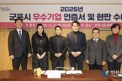 [인천광역신문] 관리자 기자 | 군포시는 17일 시청 3층 중회의실에서 ‘2025년 군포시 우수기업 인증서 및 현판 수여식’을 열고 5개 우수기업에 인증서와 현판을 수여했다. ‘우수기업 선정사업’은 2022년부터 시작하여 올해 4번째로 추진하는 사업으로 일자리 창출, 세수 증대 등 지역경제 활성화에 기여한 기업을 선정하여 인센티브를 부여하는 사업이다. 선정된 우수기업은 인증기간(3년) 동안 군포시 중소기업 육성자금 지원 시 추가 이차보전, 군포시 관내 공영주차장 이용 시 주차요금 감면, 협약병원 의료비 지원 등의 인센티브가 부여된다. 하은호 군포시장은 “어려운 경제 상황 속 관내 우수한 기업에 활력을 불어넣기 위한 우수기업 선정사업에 관심 가져주심에 감사드리며, 앞으로도 기업지원 사업을 다각화하여 기업 경영하기 좋은 환경을 만들겠다”고 말했다. 올해 선정된 군포시 우수기업은 △(주)아이씨에이치 △㈜지비티코리아 △주식회사예선테크 △듀라텍 주식회사 △㈜트리플닷 으로 총 5개 기업이다. [뉴스출처 : 경기도 군포시]
