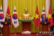 [인천광역신문] 최예준 기자 | 베트남을 국빈 방문한 이재명 대통령은 22일(현지시간) "양국은 2030년까지 교역 규모 1500억 불 목표 달성을 위해 교역·투자 협력을 더욱 호혜적으로 발전시켜 나가기로 했다"고 밝혔다. 이 대통령은 이날 또 럼 베트남 서기장 겸 국가주석과 하노이에 위치한 주석궁에서 정상회담 후 가진 공동언론발표를 통해 이 같이 말했다. 이 대통령은 발표를 통해 "베트남은 대한민국의 3위 교역·투자국이고, 한국은 베트남의 최대 투자국"라며 "약 1만 개의 한국 기업이 석유화학, 조선, 철강, 전자를 아우르는 전 분야에 진출해 높은 수준의 경제 연대를 이루고 있다"고 협력 관계를 강조했다. 또 "한국은 베트남의 '2045년 고소득 선진국 진입' 비전 실현을 위한 최적의 파트너로서, 물류, 교통, 에너지, 인프라와 같은 하드웨어 분야에서부터 과학기술, 지적재산, 창조산업 등 미래 산업 분야까지 전방위적인 협력을 추진하고 있다"고 덧붙였다. 이 대통령은 "이번 정상회담에서 '포괄적 전략 동반자' 협력을 더욱 공고히 하기로 했다"며 회담 주요 성과를 소개했다. 교